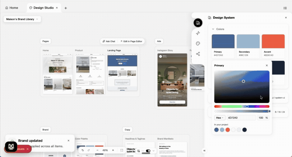 An integral part of our customers’ workflow is to have their design system and brand kit not only baked into our LLM’s responses, but also easily manageable and editable. A project I built 0→1 was Replo’s Brand Studio app, which allows users to do the following: