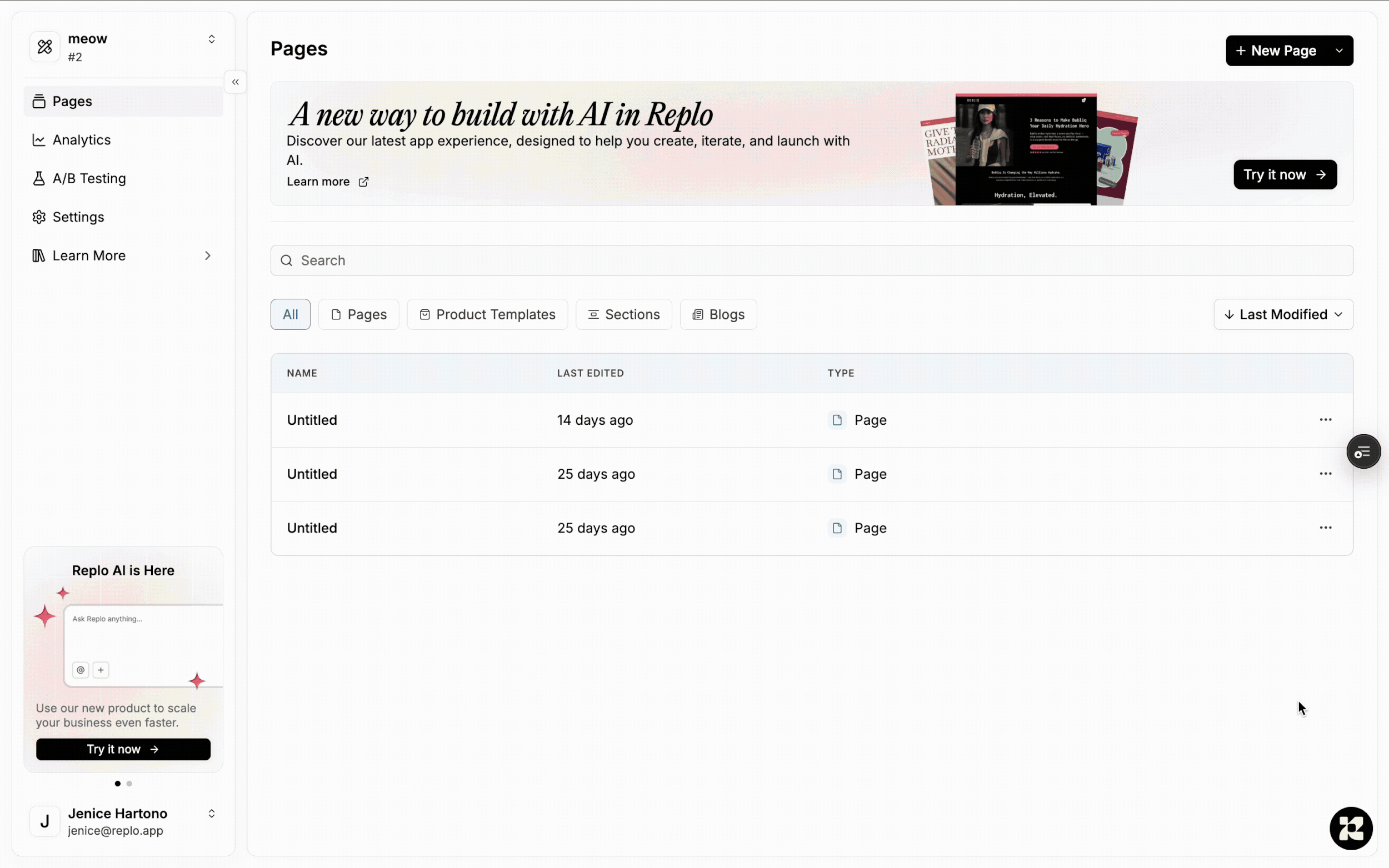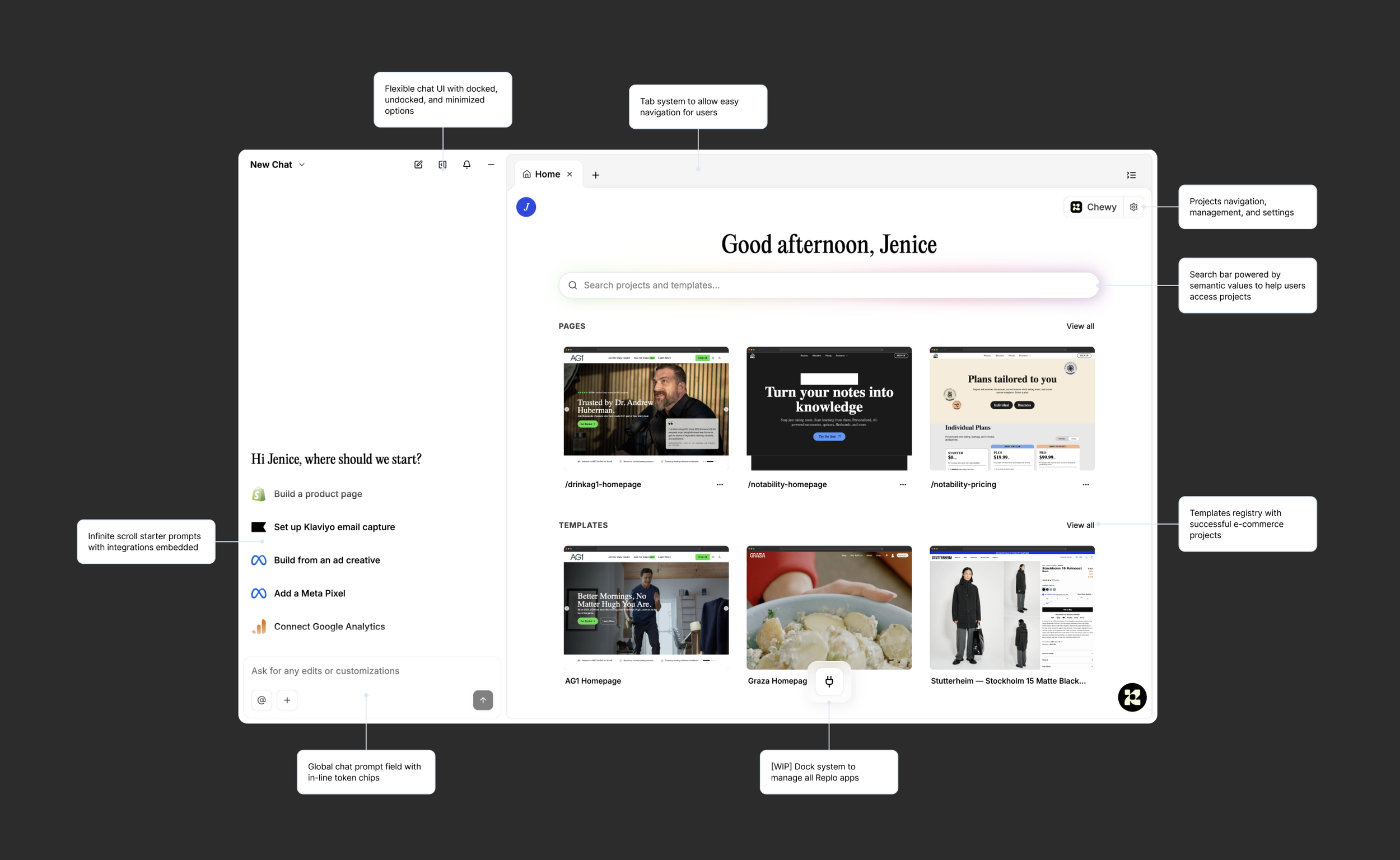 As part of the larger product initiative, I re-designed the core UI foundation of the product, turning what used to be a Shopify page builder into a new AI-powered user experience that allows Replo to function as its own Operating System (OS).
